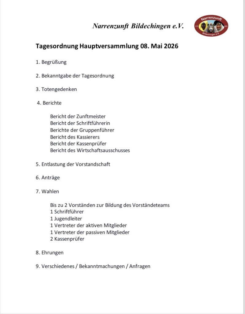 Die diesjährige Hauptversammlung der Narrenzunft Bildechingen e.V. findet am Freitag, den 08. Mai 2026 um 19.00 Uhr im Sportheim in Bildechingen statt.